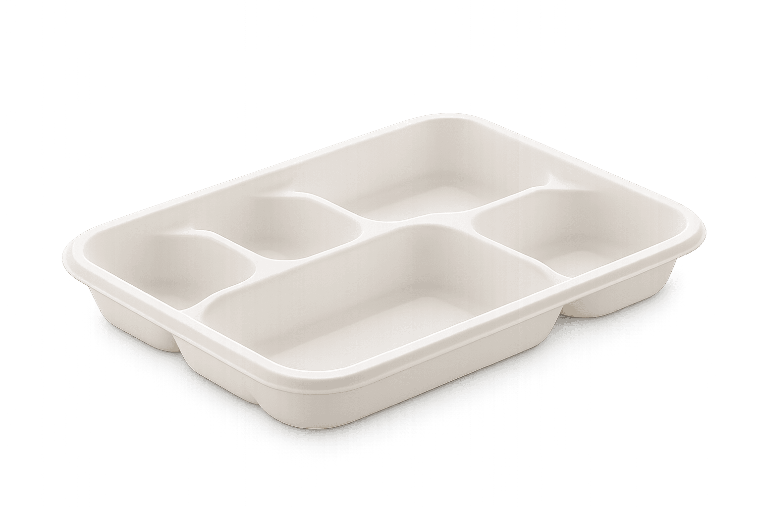 5-compartment biodegradable tray designed for meal combinations and institutional food service. Made from strong bagasse fiber for durability. Keeps different food items separated and organized. Oil-resistant and suitable for hot meals. Sustainable alternative to plastic food trays.