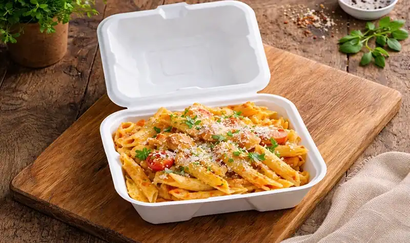 Bagasse clamshell containers are eco-friendly takeaway boxes made from sugarcane pulp (bagasse), an agricultural by-product left after juice extraction. These containers feature a hinged lid (clamshell design) that provides secure closure, making them ideal for takeaway meals, burgers, rice dishes, noodles, and combo meals.